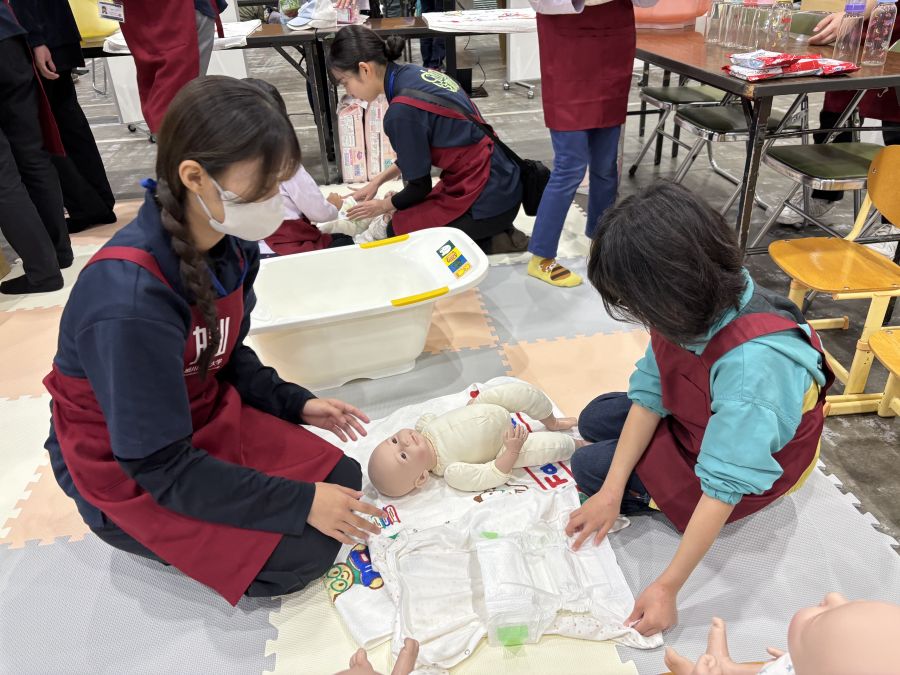 今年は、来場者も多く、本学幼児教育学科の出展ブースの「保育体験」では、赤ちゃん人形を活用した沐浴やオムツ替え、着替えの体験も椎名ゼミナールがサポートしました。