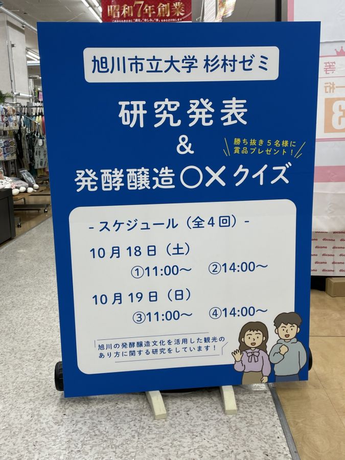 10月18日(土)三番舘本店で開催された「あさひかわ発酵醸造マルシェ」1日目で、当ゼミ3年生が研究発表と〇✕クイズ大会を実施した。午前と午後に分かれ、それぞれ3名が担当した。研究発表では、旭川の伝統文化である発酵醸造を観光に結びつける研究活動と提案について説明を行った。〇✕クイズでは、ゼミメンバーが旭川の発酵醸造に関する設問を午前と午後各10問作成し、実施した。準備した席が満員になるほど盛況であった。