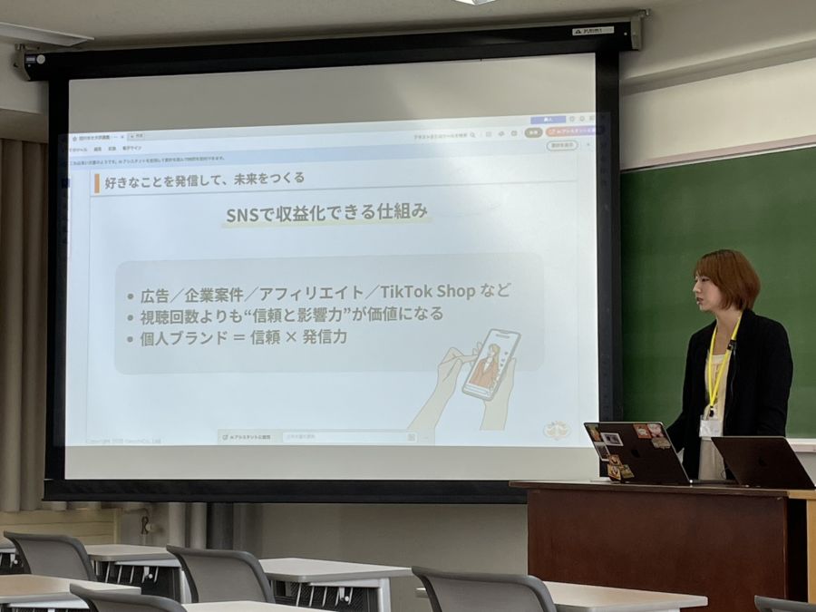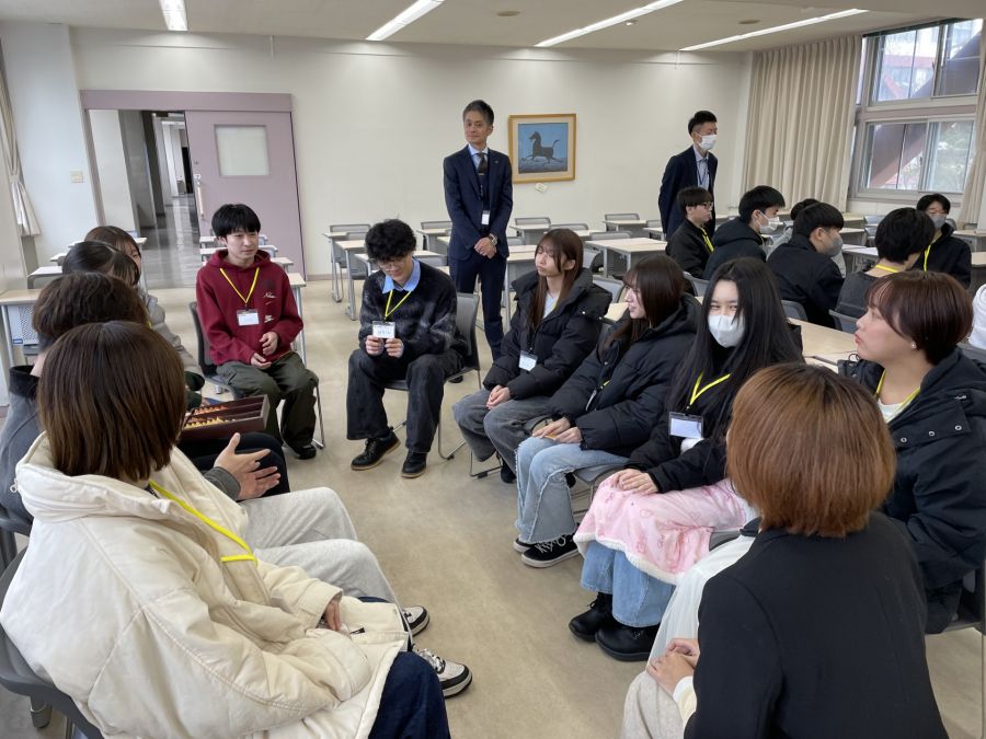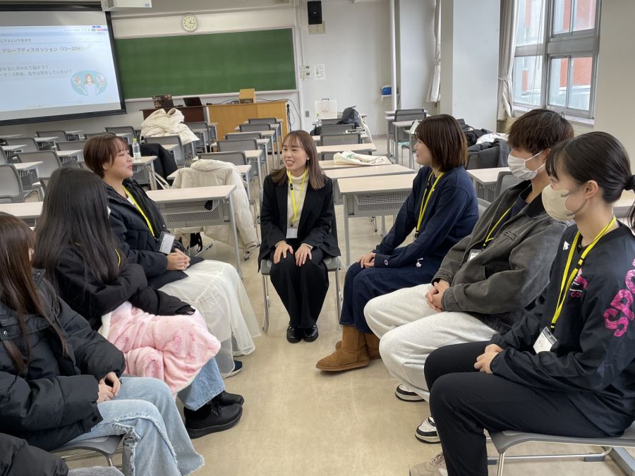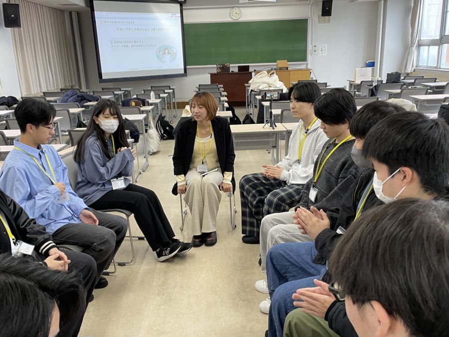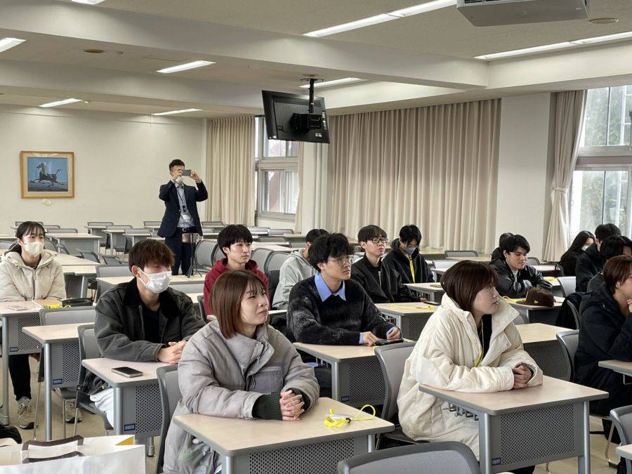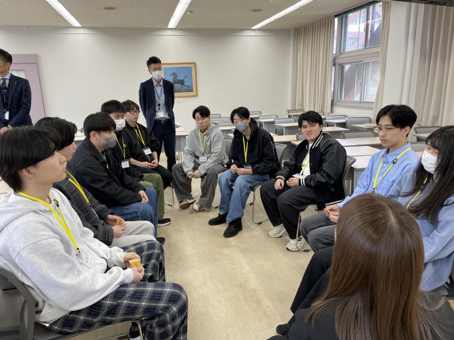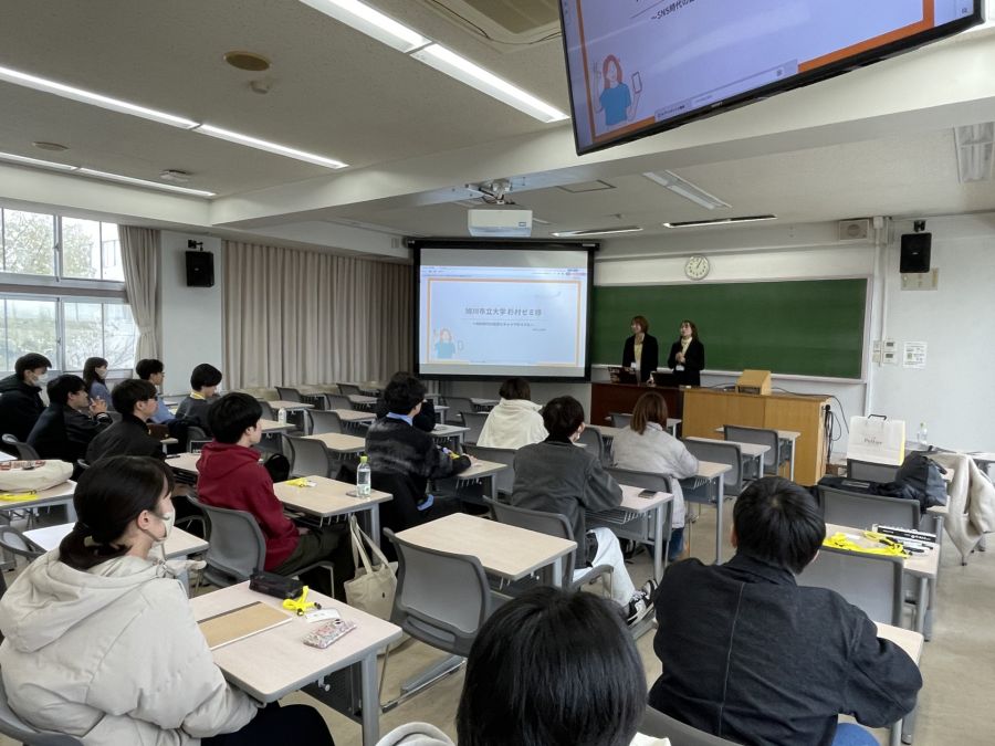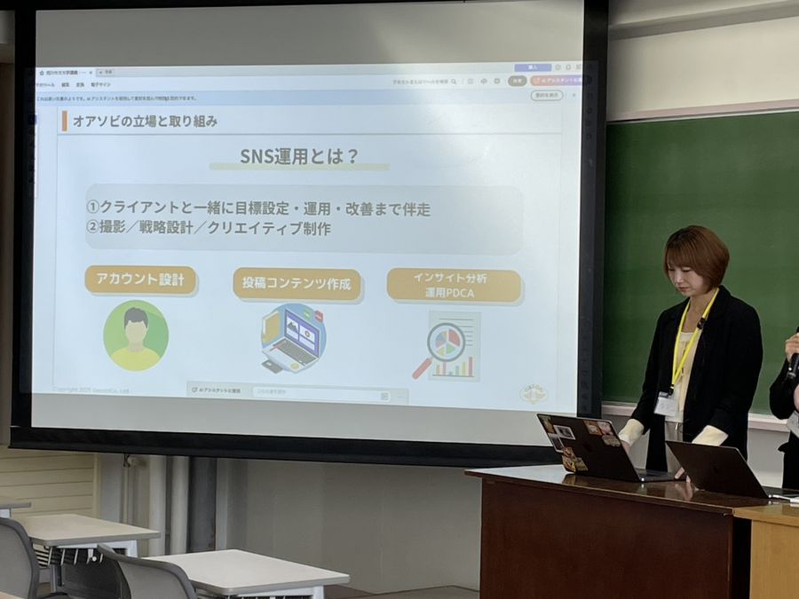 11月11日(火)本学211教室にて、東京から株式会社オアソビの担当者をお招きし、SNS関連業界および企業の研究会を開催した。当ゼミ学生2~4年生20名および株式会社オアソビからは、取締役植田夏乃子様、プロジェクトマネージャーの後藤奈々様にご参加いただいた。オブザーバーとして、旭川市企業立地課小野寺京平様、藤原駿様にもご参加いただいた。第一部として、業界・企業についてスライドを使い説明していただいた。第二部として、2組に分かれ、意見交換会を開催した。第一部では、SNS関連事業の仕組みや発展の可能性について学ぶことができた。また、第二部では、SNSの活用に限らず、担当者の方の経験を踏まえ、創業や就職、職業等について幅広く意見交換できた。とても話しやすい雰囲気をお作りいただき、内容も濃く、有意義な時間となった。