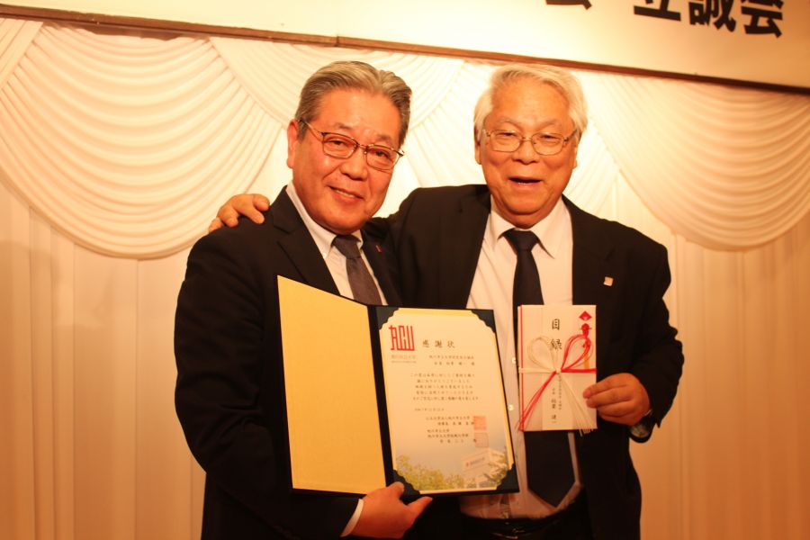 また、令和8年度に開設される「地域創造学部」の校舎整備支援として、同窓会より椅子および机の購入費用として500万円の寄附が採決されました。懇親会では柏葉会長から髙瀬理事長へ目録贈呈が行われ、未来の学びの場を支える力強い一歩として、多くの参加者から祝福の拍手が送られました。