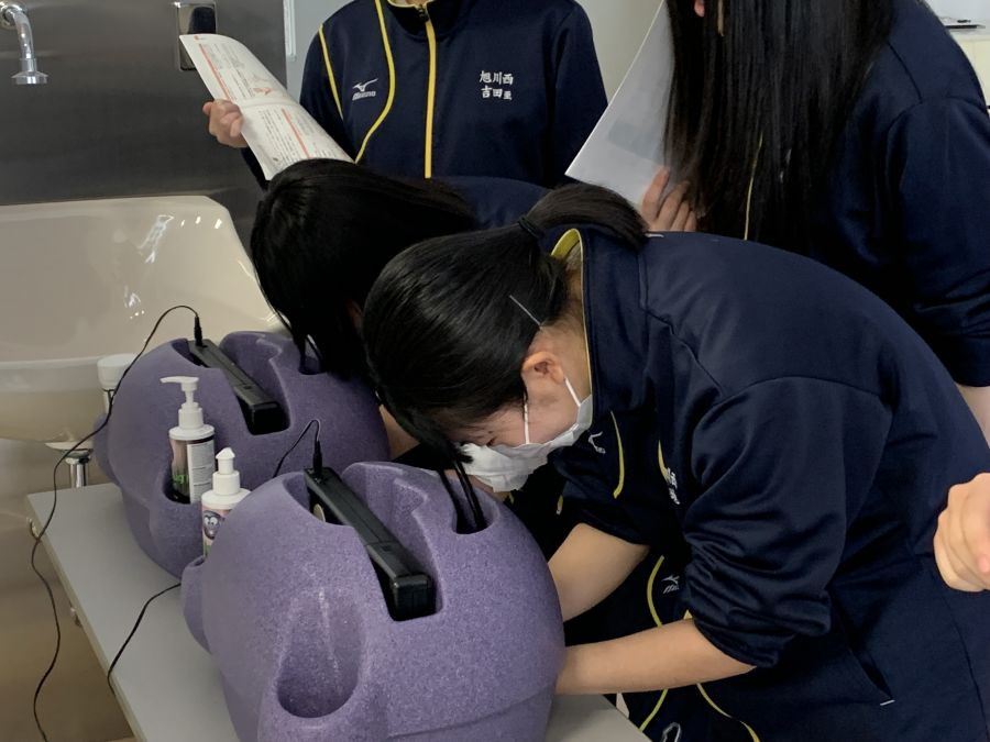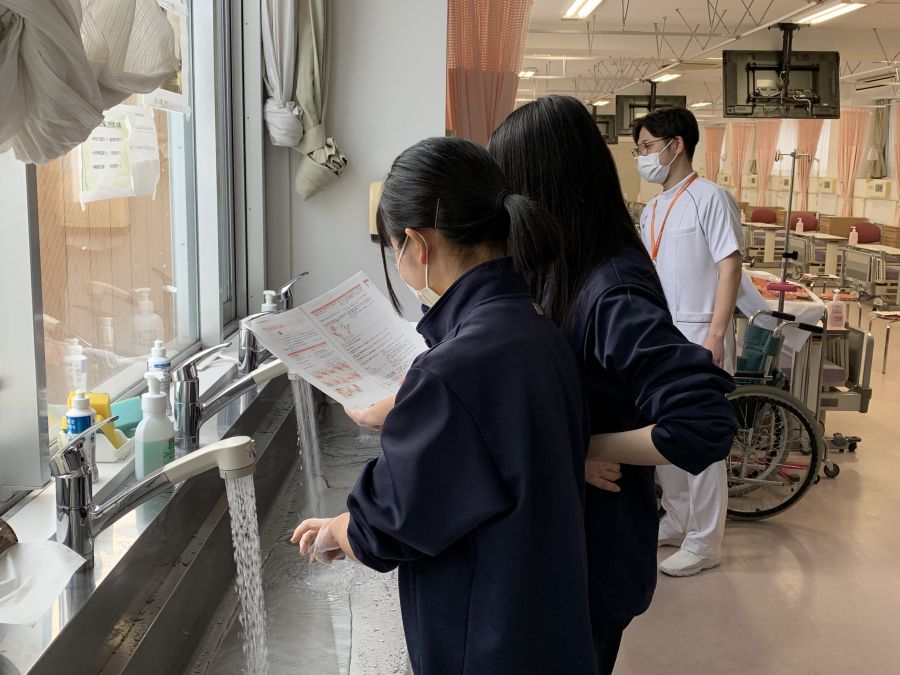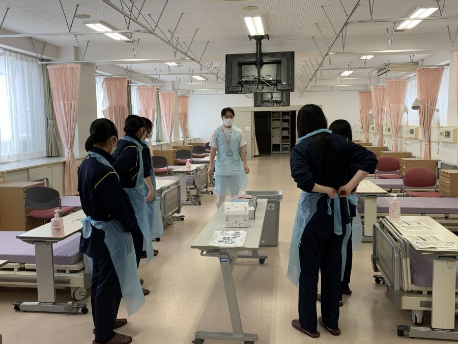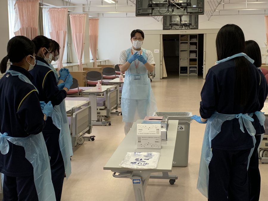 演習では、生徒同士がペアになり、手洗いの基本からやり方について行い、PPE(個人防護用具)のマスク・手袋・エプロンのことについて