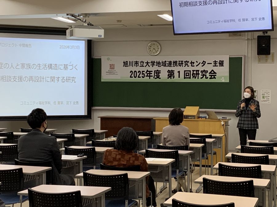 2026年3月3日(火)18時より、旭川市立大学地域連携研究センター主催の2025年度 第1回研究会が開催されました。教職員・市民の皆さま合わせて約35名の方々に参加いただきました。今回は「旭川市立大学地域連携研究センター共同研究プロジェクト」に申請された共同研究の中間報告が行われました。