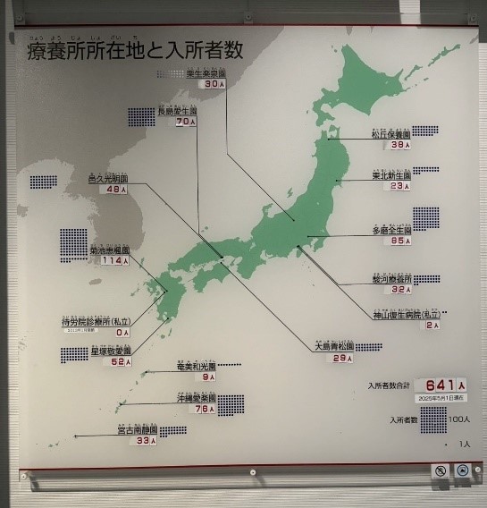 化学療法の始まり、患者運動、現在の治療状況などが紹介されており、2025年5月1日時点での療養所所在地と入所者数の展示が印象的でした。全国14か所の療養所では、展示や交流を通じて過去の過ちを繰り返さないための取り組みが続けられています。