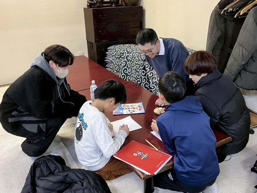 時間は、15:00~19:00でした。ご飯が出来上がるまで少し時間があったので、子どもたちは勉強したり、シール交換をしたり、絵を描いたり、それぞれが自由に楽しく過ごしました。舟山来希(1年)の似顔絵を上手にかわいく描いてくれた小学生がいました。その似顔絵と鎌田隼太朗(2年)が描いた私の似顔絵とのクオリティの差に愕然としました。また、女子2人と鎌田が手押し相撲をしていました。2人の小学生は立ったまま、鎌田は座った状態でした。結果は何度も鎌田が力負けしていました。その様子に周囲も大いに盛り上がりました。子どもたちの体力は底知れず、私たち大学生もいつもたくさんのパワーをもらっています。