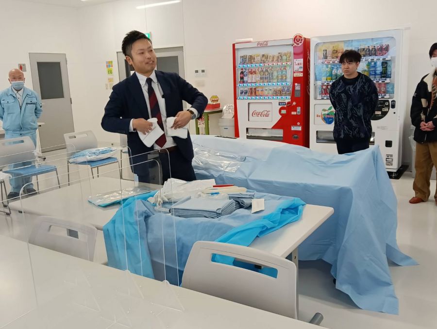 日本メディカルプロダクツ㈱東川工場にて、磯貝氏から不織布製品について説明を受けるゼミ生